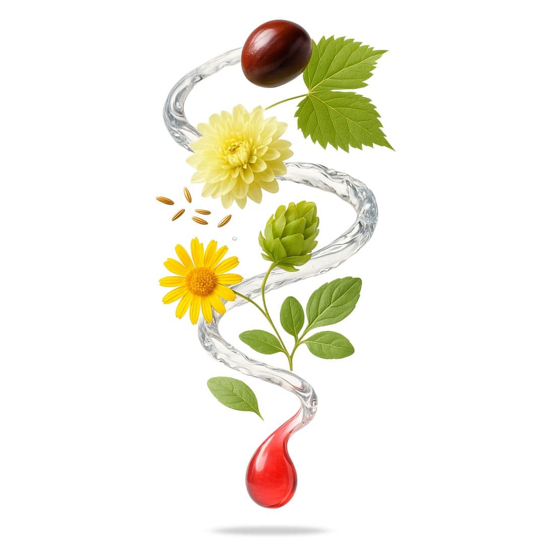 Horse Chestnut, Grape Vine Leaf, Chrysanthemum Flower, Cumin Seed, Arnica, and Hops.